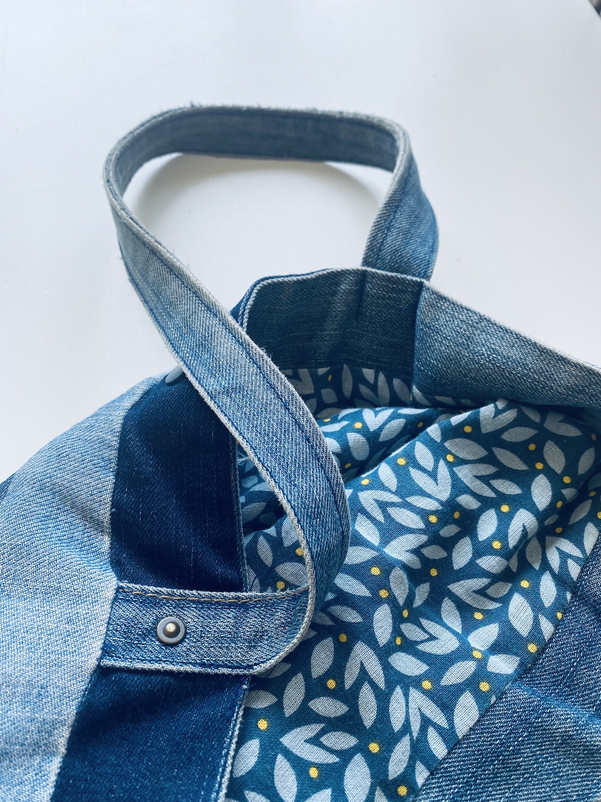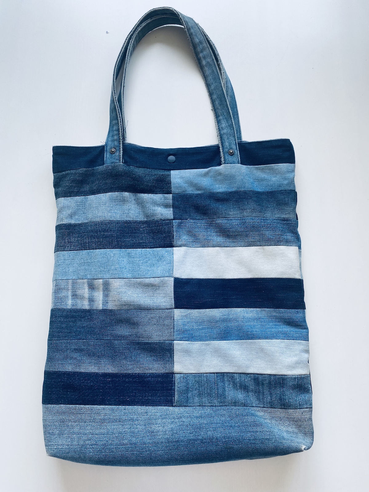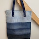 Met haar 16 tinten blauw vertaald in evenveel strookjes is dit een levendige tas.